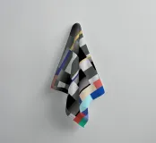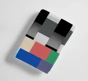 Un motivo geometrico composto da vari rettangoli, con sezioni definite da sfumature di grigio e strisce orizzontali in colori contrastanti come rosso, blu e verde. La disposizione crea un effetto visivo strutturato e vibrante, con i colori che formano una struttura a griglia.