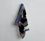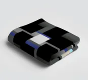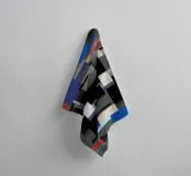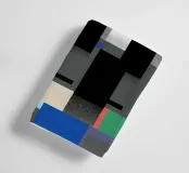 Le forme geometriche formano un motivo pixelato con un mix di nero, grigio e colori vivaci come rosso, blu e verde. Il design ha un'estetica digitale e moderna con linee orizzontali e verticali a contrasto.