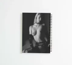 Una giovane donna seduta, in posa in topless con guanti neri e gonna corta