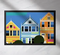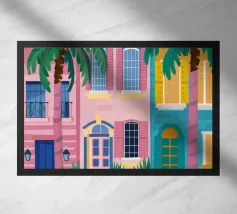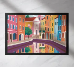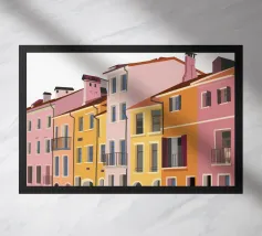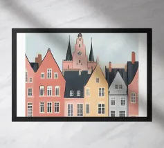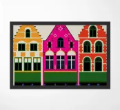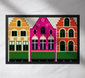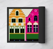 Questa immagine cattura l'architettura di Bruges con colori vivaci e precisione geometrica. Un'aggiunta perfetta a qualsiasi collezione di arte moderna. Ideale per gli amanti dei viaggi, dell'architettura e del design colorato.