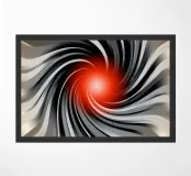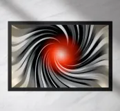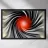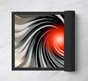 Abstrakte, dynamische Komposition mit wirbelnden Linien in Schwarz und Grau , die auf ein leuchtend rotes Zentrum (Kugel) zulaufen. Das Motiv vermittelt Bewegung und Energie.