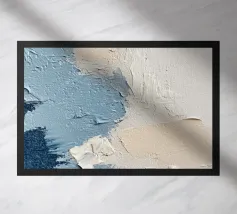Spessi strati di pittura in tonalità terrose creano una superficie strutturata con accenni di blu e rosso. La composizione astratta evoca un senso di movimento e profondità.
