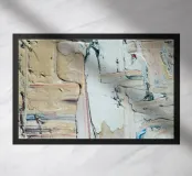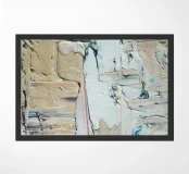 Spessi strati di pittura in tonalità terrose creano una superficie strutturata con accenni di blu e rosso. La composizione astratta evoca un senso di movimento e profondità.