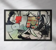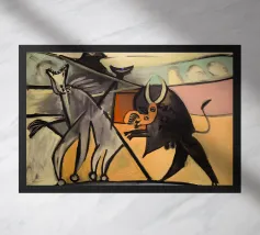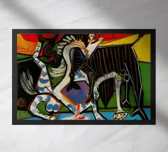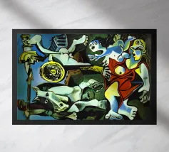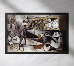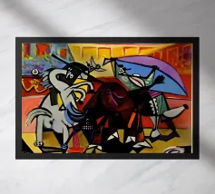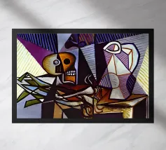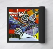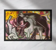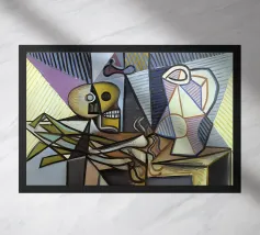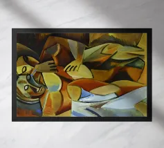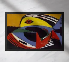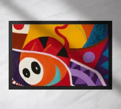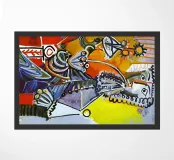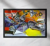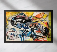 Questo dipinto astratto vibrante ed energico presenta un gioco dinamico di forme frammentate e linee audaci, con una ricca tavolozza di arancioni, gialli, viola e blu. La composizione suggerisce elementi decostruiti, forse figure o oggetti, in un movimento vorticoso ed energico, caratteristico delle influenze cubiste ed espressioniste astratte. I dettagli intricati e i colori contrastanti creano un'esperienza visiva accattivante e stimolante. Questo poster digitale di alta qualità (7000x5000 pixel, 300 dpi) cattura magnificamente l'energia grezza e il genio artistico dell'originale, ma