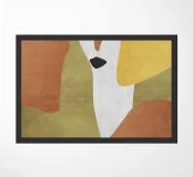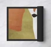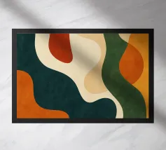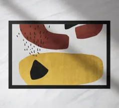 Forme astratte in tonalità terrose creano una composizione armoniosa con forme fluide e contrasti decisi. Curve organiche e macchie di ocra, marrone e oliva costituiscono il motivo centrale.