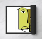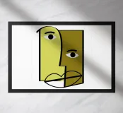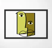 Due volti umani astratti si fondono utilizzando audaci forme geometriche e tonalità di verde e oliva. Lo stile minimalista enfatizza gli occhi e le labbra espressivi.