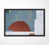 Forme geometriche e tonalità della terra creano un design moderno con linee e forme astratte. La composizione comprende rettangoli sovrapposti e un semicerchio, evidenziati da accenti dorati.