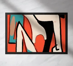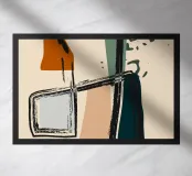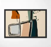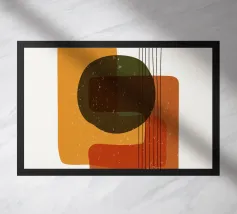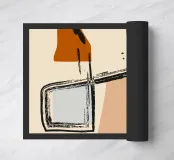 Forme astratte e pennellate decise nei toni della terra si combinano con uno sfondo chiaro. La composizione presenta rettangoli sovrapposti e schizzi a forma libera, creando un look dinamico e moderno.