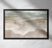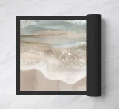 Questa illustrazione marittima mostra una veduta dall'alto del mare e della costa, con onde alte e onde dolci. I tenui colori pastello verde e beige creano un'atmosfera rilassante che ricorda i viaggi estivi e la bellezza della natura. Ideale per gli amanti dell'arte costiera e dell'atmosfera estiva.