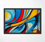 Quest'opera d'arte quadrata e astratta è caratterizzata da linee dinamiche e fluide e da forme curve che creano un effetto di aspirazione. La combinazione di colori è ricca di contrasti e vibrante, composta da colori primari: rosso forte, giallo brillante e varie tonalità di blu (dal blu chiaro al blu scuro), completati dal bianco e dal nero. Le linee di contorno nere sottolineano i segmenti curvi che attraversano la superficie come onde o nastri. Lo stile ricorda l'art déco o la pop art e trasmette un senso di movimento, velocità ed energia ritmica.
