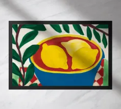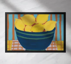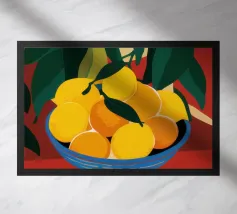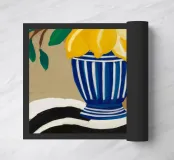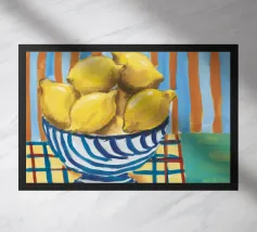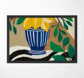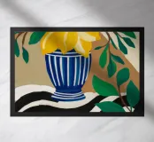 Un albero di limone stilizzato con abbondanti frutti gialli cresce da un vaso a righe bianche e blu, su uno sfondo scuro e lunatico che fa risaltare i colori vivaci della pianta.