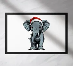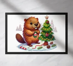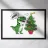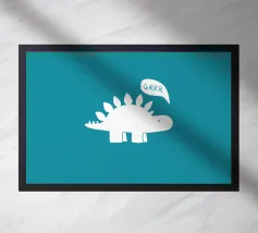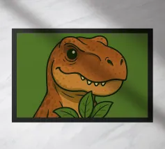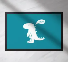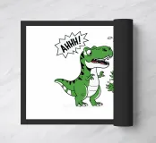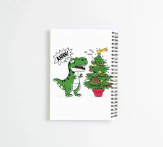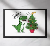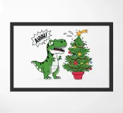 A cartoon dinosaur stands in front of a small, decorated Christmas tree, looking surprised and yelling "AHHH!". The dinosaur's expression and the tree's colorful ornaments add a humorous touch to the festive scene.