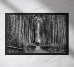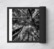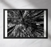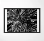 Vista in bianco e nero dal basso di una foresta di alberi molto alti.