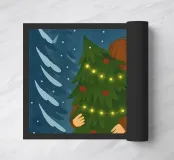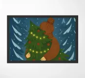 Simpatica e stravagante illustrazione natalizia di una donna che trasporta il suo albero di Natale in un paese delle meraviglie invernale. L'albero di Natale è illuminato da luci fatate.