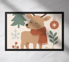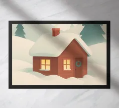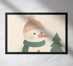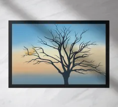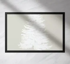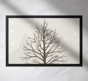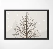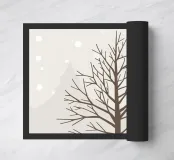 Un'illustrazione semplice e pacifica di un albero invernale spoglio circondato dalla neve che cade dolcemente. Le forme pulite e i toni tenui riflettono il classico minimalismo scandinavo, portando un senso di calma e tranquillità nel vostro spazio.