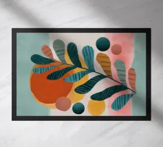 Un'audace composizione astratta presenta forme organiche in vibranti tonalità di arancio, blu e verde. Una grande forma verde simile a una foglia contrasta con il caldo sfondo arancione e rosso.