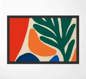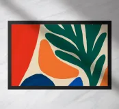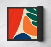 Un'audace composizione astratta presenta forme organiche in vibranti tonalitร  di arancio, blu e verde. Una grande forma verde simile a una foglia contrasta con il caldo sfondo arancione e rosso.