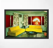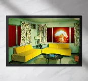 Grazioso soggiorno di metà secolo con divani gialli e un'esplosione sullo sfondo. Collage sulla fine del mondo di MsGonzalez