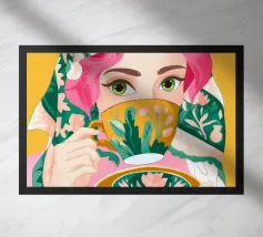 Questa opera d'arte presenta una tavola imbandita con una brocca, un vaso con fiori, un piatto con una fetta di limone e una tazza. Lo sfondo è costituito da una parete rosa e da una tovaglia verde, che creano un ambiente allegro e invitante per la colazione.