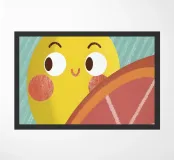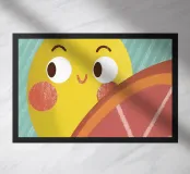 L'allegra illustrazione presenta un personaggio sorridente di un limone giallo accanto a una fetta d'arancia.