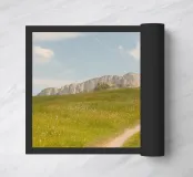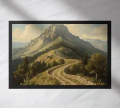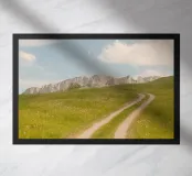 A winding dirt path curves through a vibrant green alpine meadow dotted with wildflowers, leading toward dramatic limestone cliffs under a soft cloudy sky. This serene mountain trail captures the peaceful beauty of Swiss hiking landscapes and the timeless appeal of rural mountain paths. Perfect for bringing a sense of adventure and natural tranquility to any space.