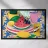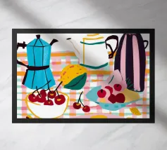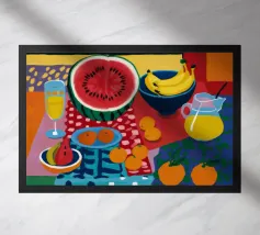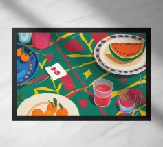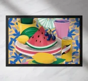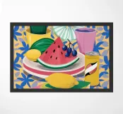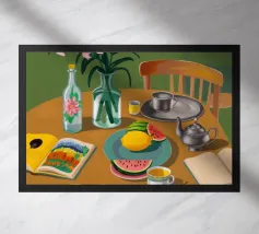 Una natura morta con una fetta di anguria, una tazza di succo di frutta e una pila di libri su una tovaglia colorata e a fantasia. La composizione è una rappresentazione fresca, intellettuale ed elegante della lettura e dei piaceri estivi.