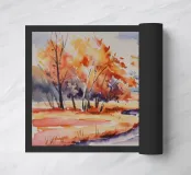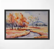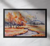 Un sereno paesaggio autunnale che raffigura un fiume che scorre dolcemente attraverso una campagna di alberi ornati da fogliame autunnale dorato e arancione, sotto un cielo morbido e vaporoso. Lo stile dell'acquerello esalta la qualità tranquilla e pittoresca della scena.
