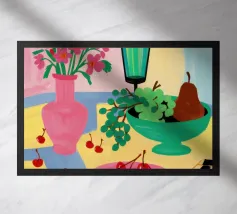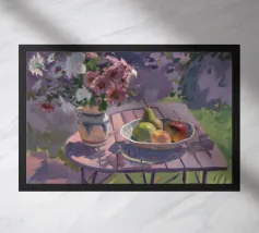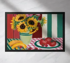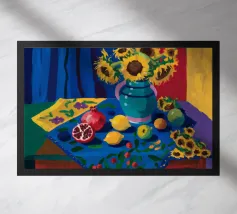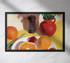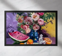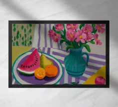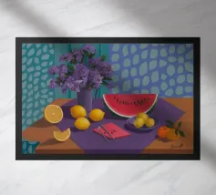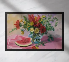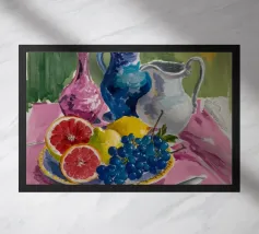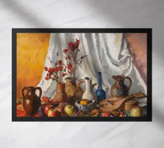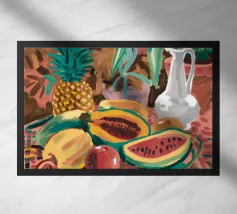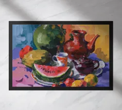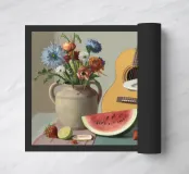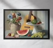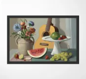 Una natura morta rustica e calda con una chitarra, una brocca, un'anguria e dell'uva. La composizione evoca un senso di vita di campagna piacevole e creativa, con toni caldi e terrosi e una disposizione rilassata e armoniosa.