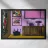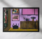 L'ambiente interno è caratterizzato da pareti rosa caldo, un mobile in legno che espone oggetti decorativi, una parete di galleria eclettica e una vista su una stanza adiacente.