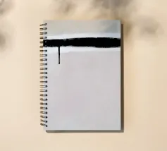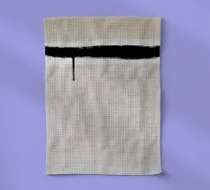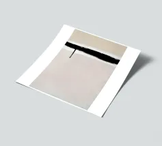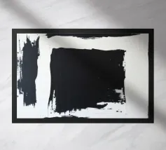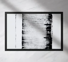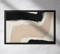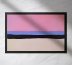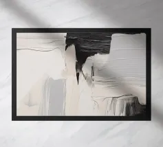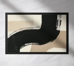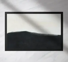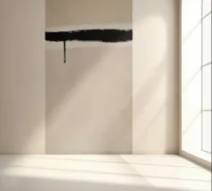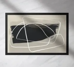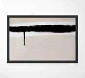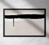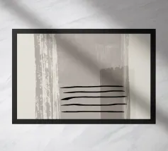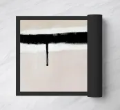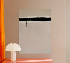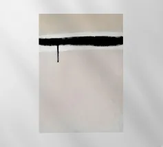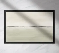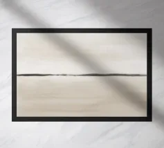 Un dipinto minimalista della linea dell'orizzonte, che mostra una rappresentazione astratta con una singola linea nera in alto e un'altra in basso, creando uno spazio negativo nei toni del beige e del bianco. L'opera incarna la semplicità attraverso le sue linee pulite e l'uso minimalista del colore, trasmettendo serenità su uno sfondo chiaro. Non è semplicemente arte, ma piuttosto un'espressione emotiva o una contemplazione visiva.