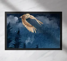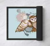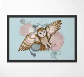 Disegno selvaggio ad acquerello di un barbagianni. Il gufo vola in aria in posizione di attacco con le zampe distese davanti a sé, pronto ad afferrare la preda. L'immagine è stata post-processata digitalmente, con l'aggiunta di uno sfondo dinamico con colature.