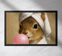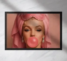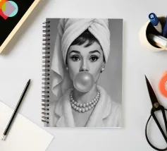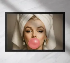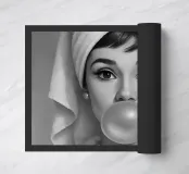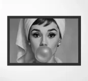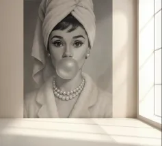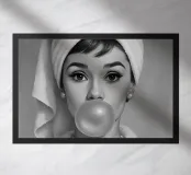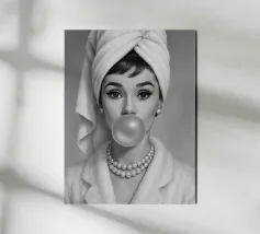 Ritratto di Audrey che soffia gomme da masticare con accappatoio e asciugamano sulla testa, in bianco e nero.