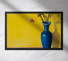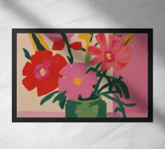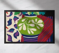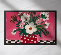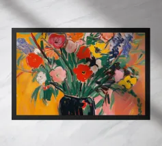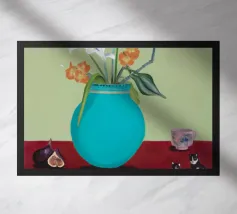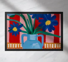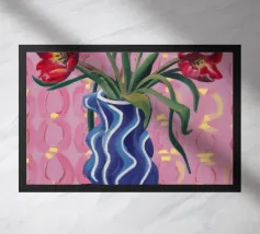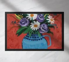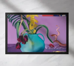 Un vaso blu turchese brillante racchiude un rigoglioso bouquet di fiori viola, rosa e rossi, disposti in modo drammatico su una superficie zebrata su uno sfondo rosso intenso.