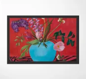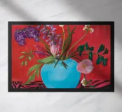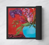 Un vaso blu turchese brillante racchiude un rigoglioso bouquet di fiori viola, rosa e rossi, disposti in modo drammatico su una superficie zebrata su uno sfondo rosso intenso.