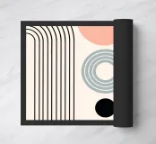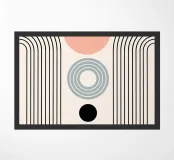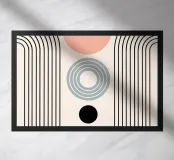 Le forme geometriche sono disposte in una composizione equilibrata con cerchi, archi e semicerchi in tonalità tenui. Il design è caratterizzato da un gioco di linee e forme che creano un senso di simmetria e armonia.