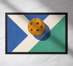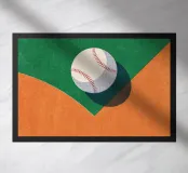 Una palla da baseball si trova sull'iconico contrasto tra il campo da gioco verde e la superficie sabbiosa arancione di un campo da baseball. Le forme minimaliste e i colori decisi conferiscono al design un'estetica retrò che cattura perfettamente l'energia e l'eccitazione del baseball. Ideale per i fan del baseball e gli amanti dei design sportivi.