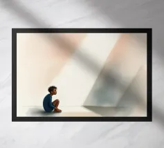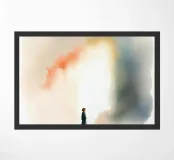 Un bambino in abiti scuri è immobile in un ambiente mistico, di fronte a un gradiente di colore che contrasta con la nebbia ombrosa. La scena è tranquilla e allo stesso tempo profonda, e suscita un pensiero profondo.