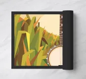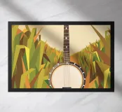 Illustrazione di un banjo posizionato tra l'erba con un caldo stile geometrico.