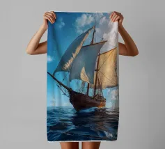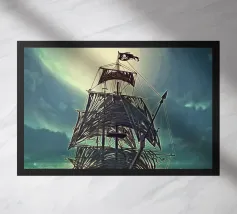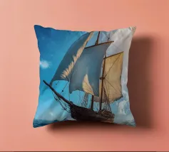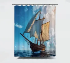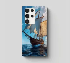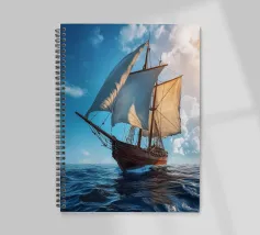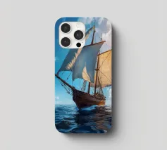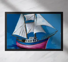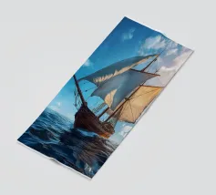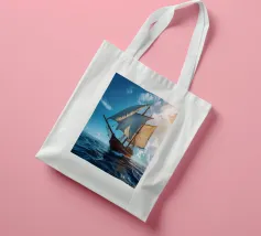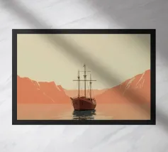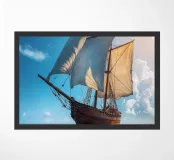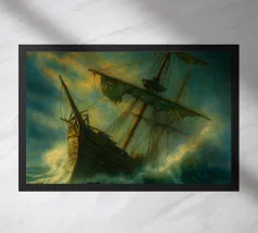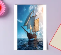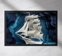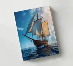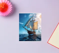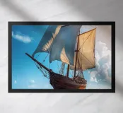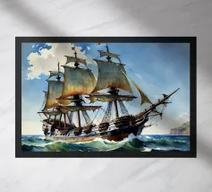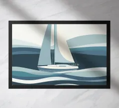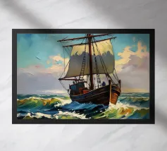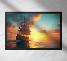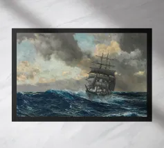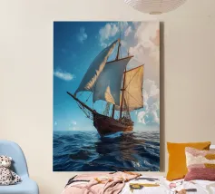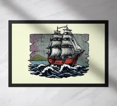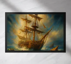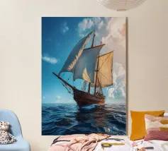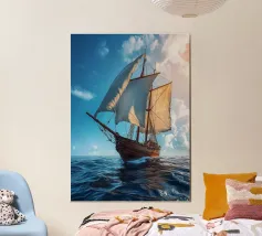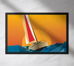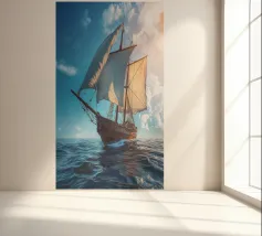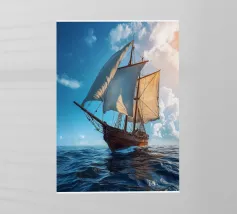 Un veliero storico fende con forza le onde blu profondo sotto un cielo vivido. La luce del sole al tramonto dona alla vela riflessi caldi e fa apparire l'imbarcazione maestosa. Questo poster cattura in modo impressionante il fascino della navigazione a vela e la libertà del mare aperto - un punto di forza per gli interni marittimi.