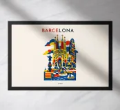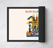 Una vivace celebrazione grafica di Barcellona, resa viva da geometrie audaci e energici blocchi di colore. Forme architettoniche iconiche si ergono in armoniosa sovrapposizione, fondendo monumenti storici con l'inconfondibile spirito creativo della città. Forme giocose, motivi ritmici e contrasti decisi conferiscono alla composizione movimento e calore, catturando il carattere espressivo di Barcellona senza ricorrere a dettagli minuziosi.