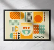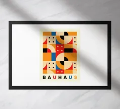 Aggiungete un tocco di eleganza senza tempo al vostro spazio con questa stampa d'arte a motivi geometrici ispirata alla Bauhaus. Le linee pulite, le forme astratte e le calde tonalità della terra creano un design sorprendente e moderno. Perfetta per gli amanti dell'arte moderna e minimalista di metà secolo. Progettato da showmemars