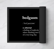Concedetevi il massimo del comfort con la nostra spiritosa stampa tipografica "Bedgasm". Questo design intelligente presenta una definizione umoristica in stile dizionario con un testo serif bianco e nitido su un elegante sfondo nero. Perfetta per l'arredamento della camera da letto o come regalo per gli amanti del sonno, cattura la sensazione di beatitudine che si prova quando si sprofonda nel letto dopo una lunga giornata. Il contrasto netto e lo stile tipografico formale creano un pezzo di grande impatto visivo, divertente ed elegante. Disponibile su diversi prodotti, questo design versatile aggiunge un tocco di umorismo al vostro spazio. Abbracciate il vostro amore per il sonno!