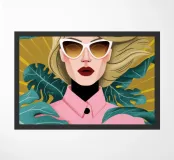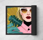 This artwork portrays a person with blonde hair, dressed in a pink shirt, set against a background of green leaves. It evokes calm and beauty.