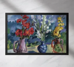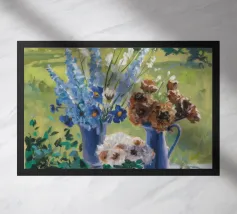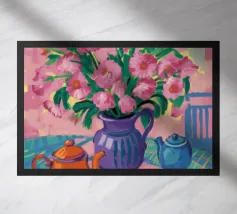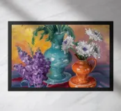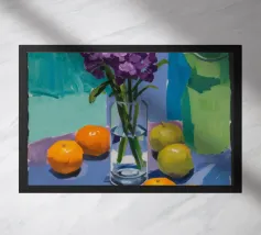Una natura morta riccamente colorata mette in mostra un vibrante bouquet di lavanda viola e margherite bianche in una brocca blu, accanto a una brocca arancione più piccola e a limoni gialli brillanti su una superficie drappeggiata viola su uno sfondo giallo-arancio caldo, creando una composizione audace e gioiosa.