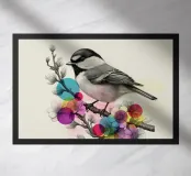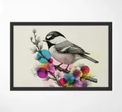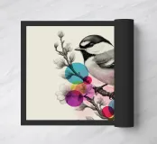 Questa affascinante stampa d'arte cattura un delicato uccello appollaiato su un ramoscello fiorito, illustrato con raffinati dettagli botanici ed eleganza naturale. Accentuato da cerchi astratti traslucidi e vibranti nei toni del rosa, dell'arancione, del verde e del giallo, il disegno fonde magnificamente l'illustrazione naturalistica classica con un tocco artistico audace e moderno. Ideale per gli amanti della natura, gli appassionati di birdwatching o di decorazioni floreali e faunistiche, questo poster aggiunge un tocco artistico e fresco a soggiorni, camere da letto o spazi creativi.