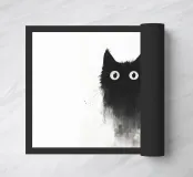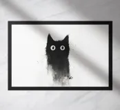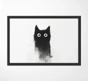 Un'illustrazione stravagante di un gatto nero con occhi ampi e curiosi, che si fonde perfettamente con un effetto acquerello astratto e strutturato. Il disegno crea un'atmosfera giocosa e artistica con il suo stile minimalista ma espressivo.