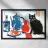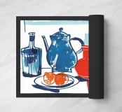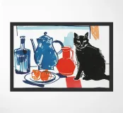 Die Zeichnung zeigt eine harmonische Szene mit einer Katze, die auf einem Esstisch sitzt. Das Motiv ist in weichen Pastelltönen gehalten und passt ideal als Wanddekoration für Wohnräume, Schlafzimmer oder Büros.