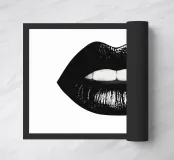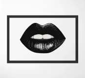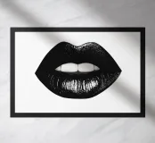 Un poster minimalista in bianco e nero con una bocca da baciare e labbra nere incarna l'eleganza e lo stile del mondo della moda, ispirato a Vogue.