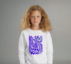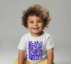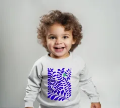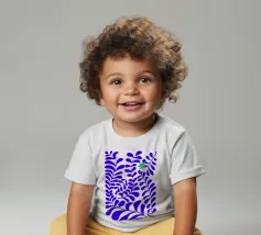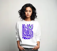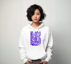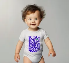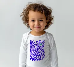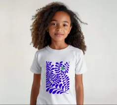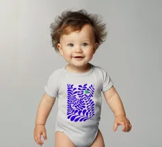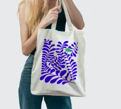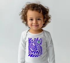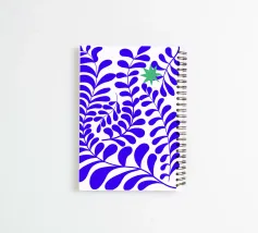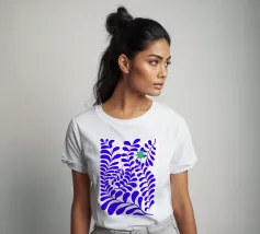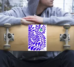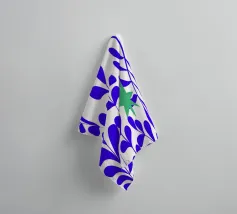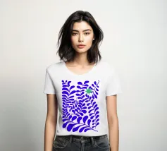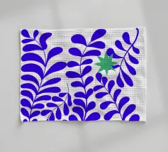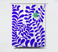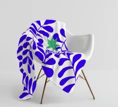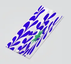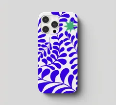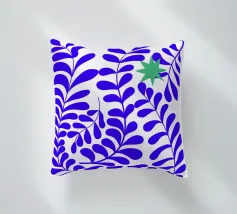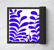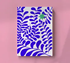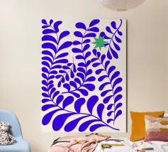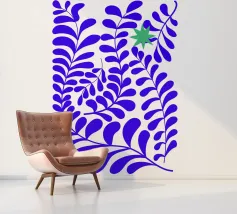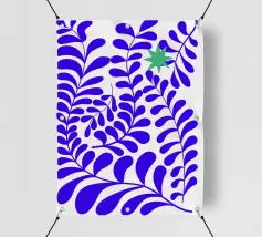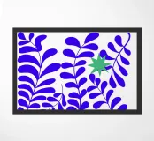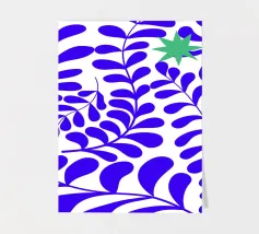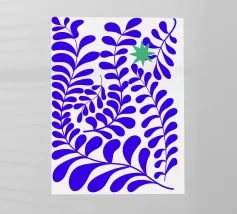 Le foglie blu si allungano creando una composizione audace e vibrante. Una singola stella verde spicca tra le foglie, aggiungendo un tocco di contrasto.