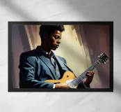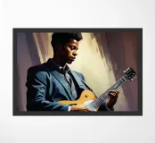 Un giovane chitarrista blues e jazz di colore nel bel mezzo di un assolo durante un'esibizione dal vivo.